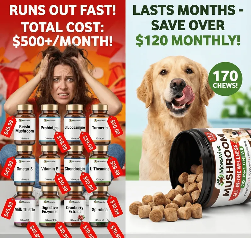 Stop juggling dozen of expensive, single-ingredient supplements. While competitors sell small 30-count jars that disappear in weeks, Mosswise delivers a massive 170-chew supply of our 30-in-1 formula. By combining 7 medicinal mushrooms, probiotics, and glucosamine into one delicious chicken-flavored bite, we provide a comprehensive wellness routine that lasts for months, saving you over $120 monthly compared to buying individual bottles.